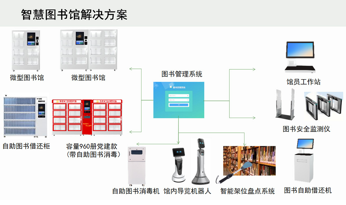 由館情導(dǎo)覽機(jī)器人、圖書查詢機(jī)、智能架位盤點(diǎn)系統(tǒng)、圖書自助借還機(jī)、出入口圖書安全監(jiān)測(cè)儀,閘機(jī)、移動(dòng)圖書館、圖書管理系統(tǒng)、館員工作站、電紙書閱讀本借還柜、圖書自助借還柜、自助圖書消毒機(jī)等設(shè)備及系統(tǒng)組成。