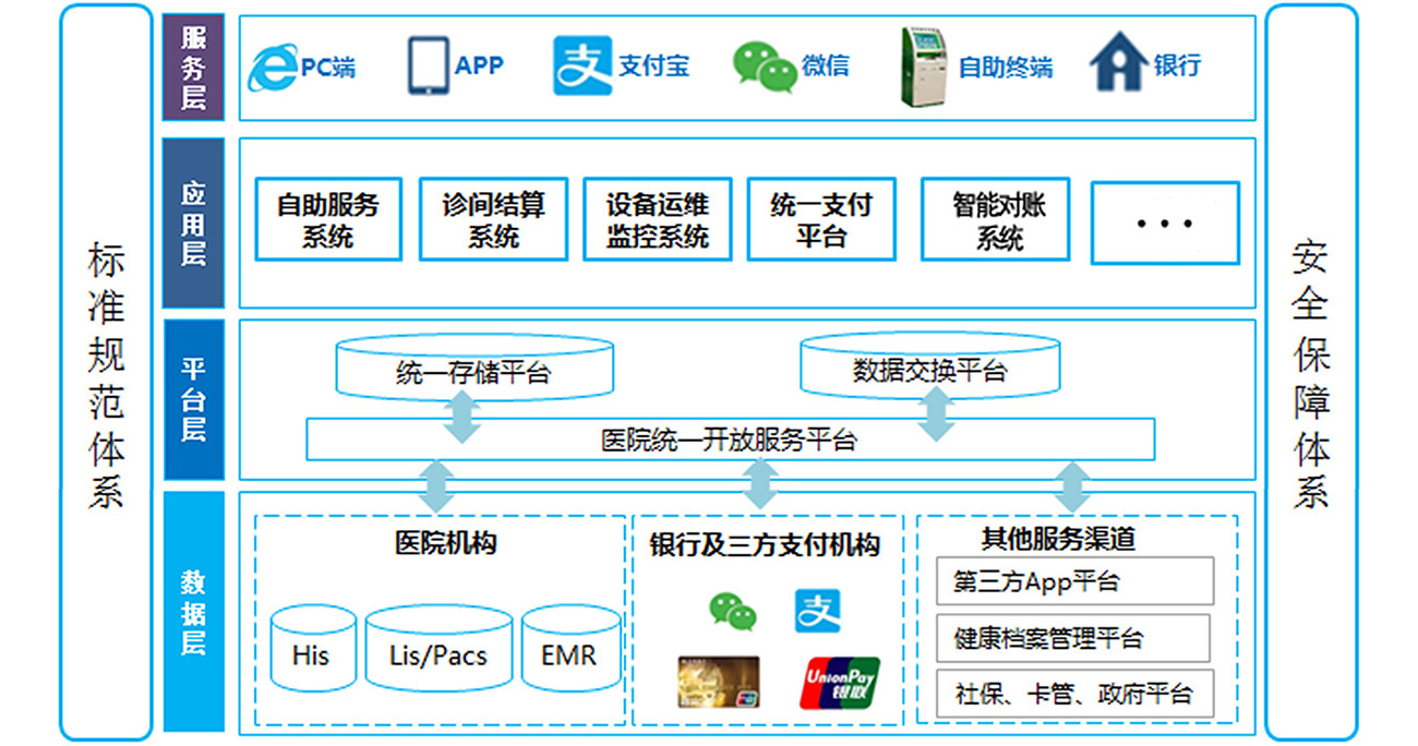 智慧銀醫(yī)服務(wù)技術(shù)方案是在原有的數(shù)字醫(yī)院基礎(chǔ)上,借助先進(jìn)的信息化技術(shù)?段,《醫(yī)院智慧服務(wù)分級評估標(biāo)準(zhǔn)體系(試行)》、安全保障體系構(gòu)建智慧醫(yī)療綜合服務(wù)?體化平臺,通過對醫(yī)院HIS、LIS、PACS、EMR以及管理系統(tǒng)的信息整合,集成現(xiàn)?、銀?卡、?付寶、微信、居?健康卡、社??ê驮\療卡等多種?付?式,實(shí)現(xiàn)多渠道安全?付,通過與醫(yī)院HIS、社保前置、醫(yī)保前置、銀?前置、銀聯(lián)前置等系統(tǒng)的互通互聯(lián),通過自助服務(wù)系統(tǒng)、診間結(jié)算系統(tǒng)、設(shè)備運(yùn)維管理系統(tǒng)、統(tǒng)一支付平臺、智能對賬系統(tǒng)等多智慧系統(tǒng)與HIS、LIS、ERP等系統(tǒng)相互耦合實(shí)現(xiàn)多系統(tǒng)數(shù)據(jù)有效共享,實(shí)現(xiàn)診療服務(wù)數(shù)據(jù)收集、存儲、處理、提取及數(shù)據(jù)交換,以現(xiàn)代智能終端為載體,讓患者能夠更多地參與到診療過程當(dāng)中,加強(qiáng)醫(yī)患信息互聯(lián)共享,實(shí)現(xiàn)從診前到診后的“一站式”服務(wù),實(shí)現(xiàn)線上線下結(jié)合,減少患者排隊時間,提供便捷的就醫(yī)服務(wù)和獲得感,旨在讓信息多跑路,多共享,提?醫(yī)護(hù)服務(wù)效率、降低醫(yī)院運(yùn)營和管理成本。