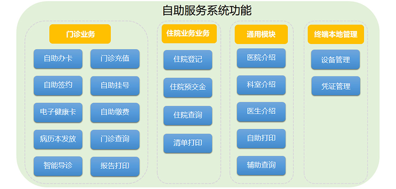 自助建檔 自助簽約 自助掛號 自助繳費(fèi) 自助充值 自助報到 銀行卡余額查詢 信息查詢 自助打印檢查化驗(yàn)單 費(fèi)用記錄 滿意度調(diào)查 自助票據(jù)打印 自助設(shè)備清機(jī)管理