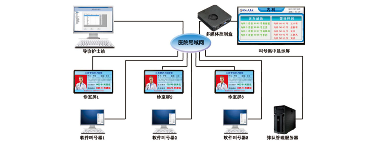 門診分診叫號系統(tǒng)通過醫(yī)院內(nèi)部組建的局域網(wǎng)將診間壁掛機(jī)、診間大屏、護(hù)士工作站以及醫(yī)生工作站有機(jī)的聯(lián)系在一起?;颊咄ㄟ^診間壁掛機(jī)進(jìn)行就診簽到排隊,實(shí)現(xiàn)了病患對就診時間安排的可預(yù)見性。醫(yī)生工作站通過叫號系統(tǒng),實(shí)現(xiàn)患者有序的就診,營造良好的診室就診環(huán)境。同時,對排隊的患者進(jìn)行針對性叫號,減少無效的叫號過程,提高就診效率。